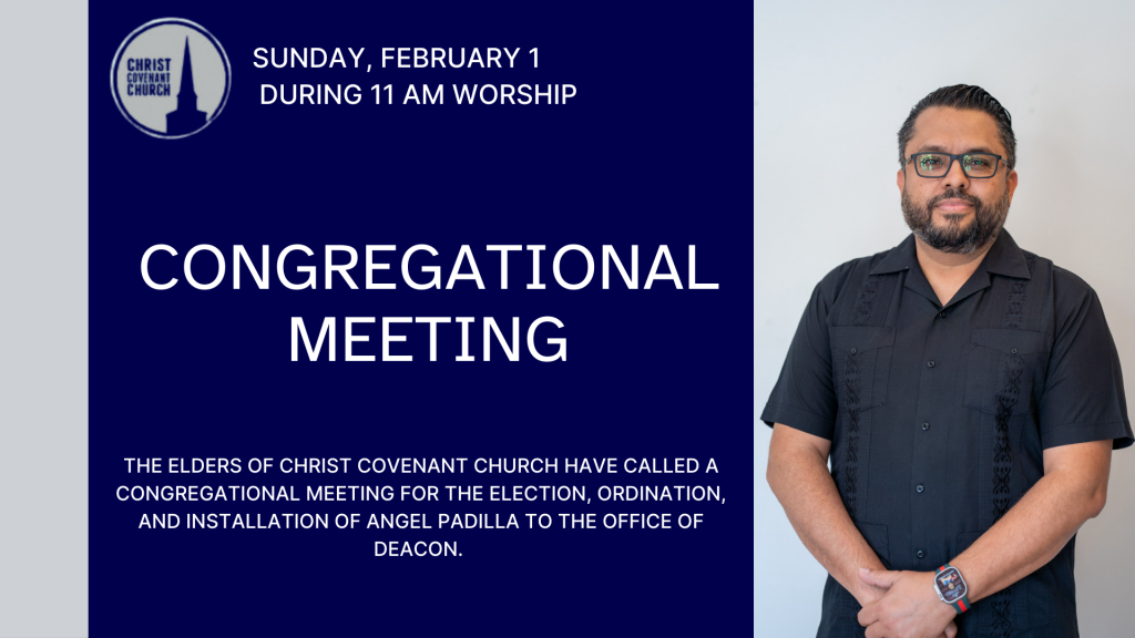 Christ Covenant Church has called a congregational meeting for the election, ordination, and installation of Angel Padilla to the office of Deacon. All communicating members are encouraged to attend and participate.